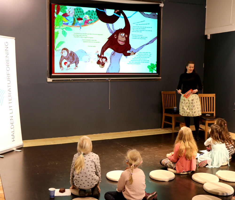 Dette var første gangen Litteraturforeningen hadde forfattermøte i lokalene etter bokhandler Andersen i gågata. Denne fine vinterdagen var det ti barn – og endel voksene – som fikk med seg bokopplevelsen, kaker, saft og kaffe.