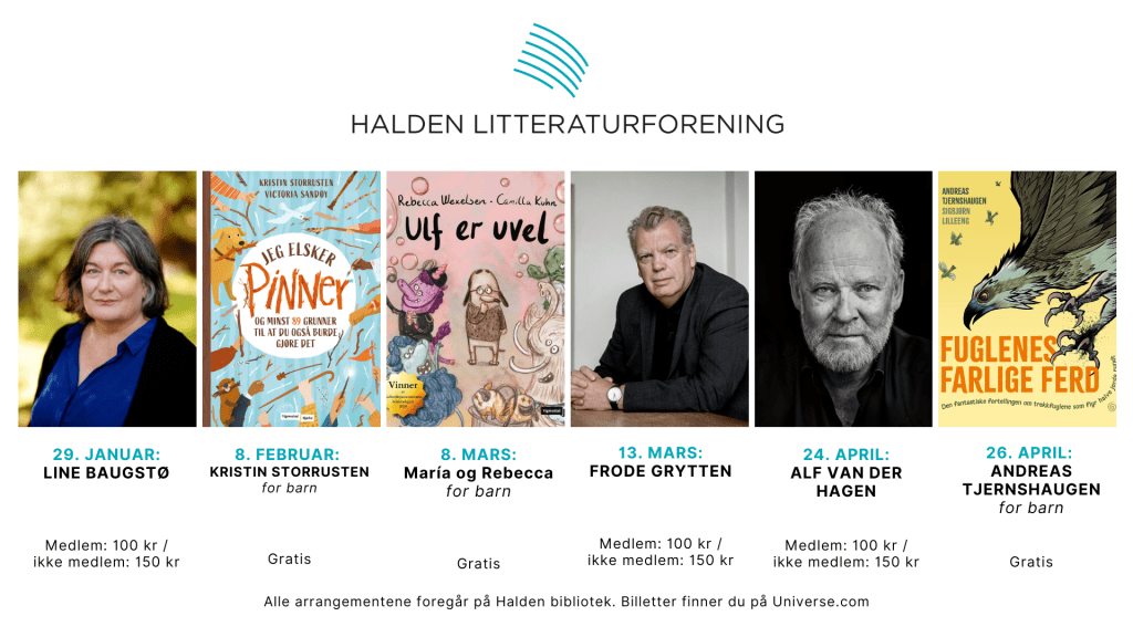 Vi har nå inngått et samarbeid med Halden bibliotek om våre barnearrangement, og flytter derfor disse fra søndag til lørdag. Vær derfor obs på at alle forfattermøter for barn nå starter lørdager kl.12.