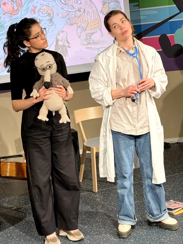 Denne lørdagen stod boka «Ulf er uvel» på programmet. Men barna fikk så mye mer enn det. Et samspill mellom forfatter Rebecca Wexelsen og musiker María Alejandra Conde-Campos bygde opp en fin forestilling som vekslet mellom Maria på cello og Rebecca som både leste fra boka, samtalte med og inkluderte barna – og Maria – samt litt skuespill. Og så var selvfølgelig hovedpersonen hunden Ulf med.