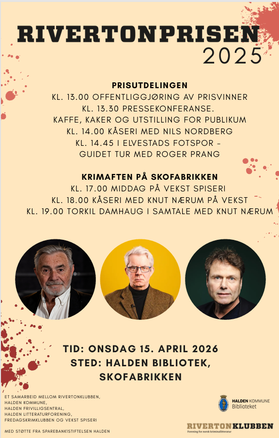 Den samme dagen som Rivertonprisen deles ut i Halden inviterer vi til krimaften her på Skofabrikken. Dette gjøres i samarbeid med Fredagskrimklubben, Halden frivilligsentral, Vekst Spiseri og Halden litteraturforening.
